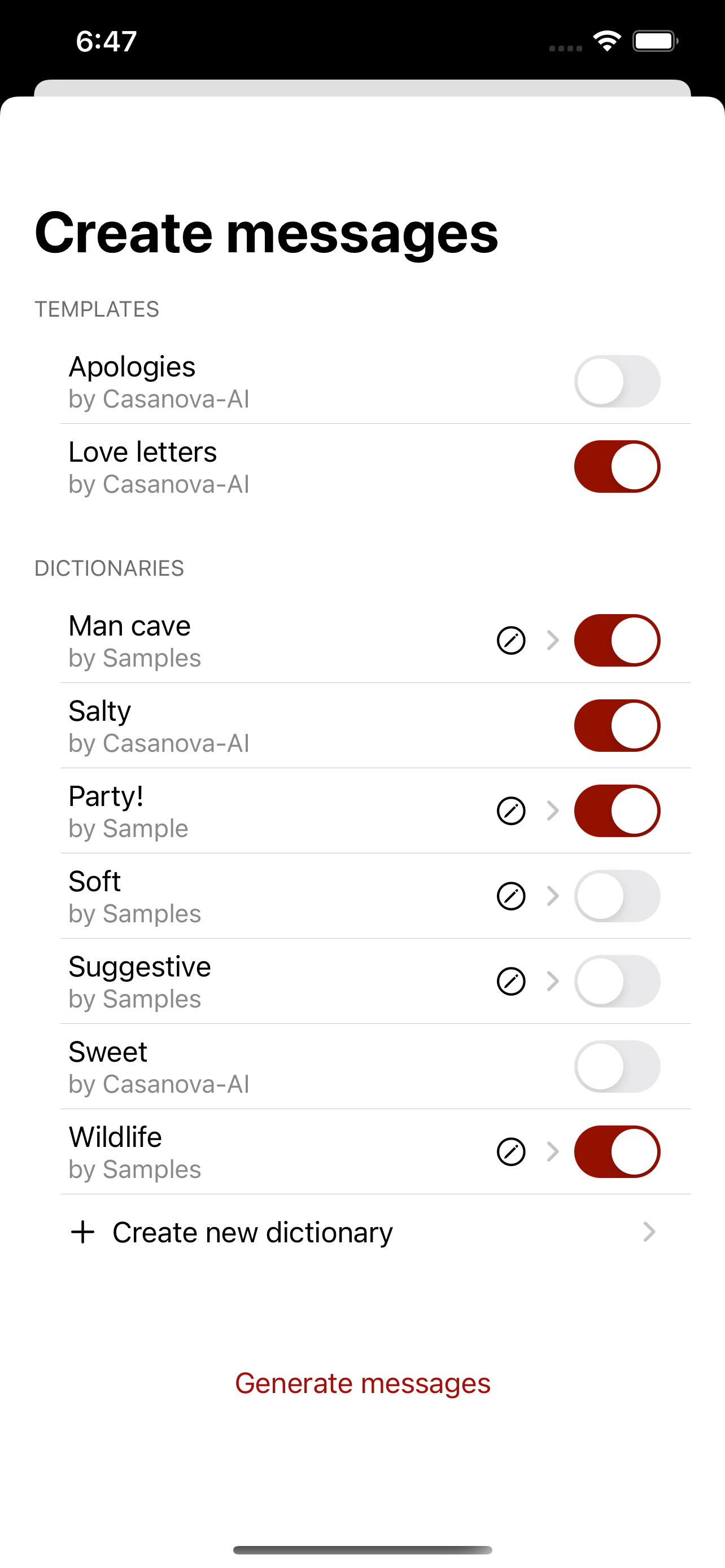Send her unique sugar-coated messages. Let the AI propose templates and dictionaries. Create your own dictionaries to better fit her or your hobbies, profession, interests, and life. You can romanticize her messages anytime with countless autogenerated message combinations.