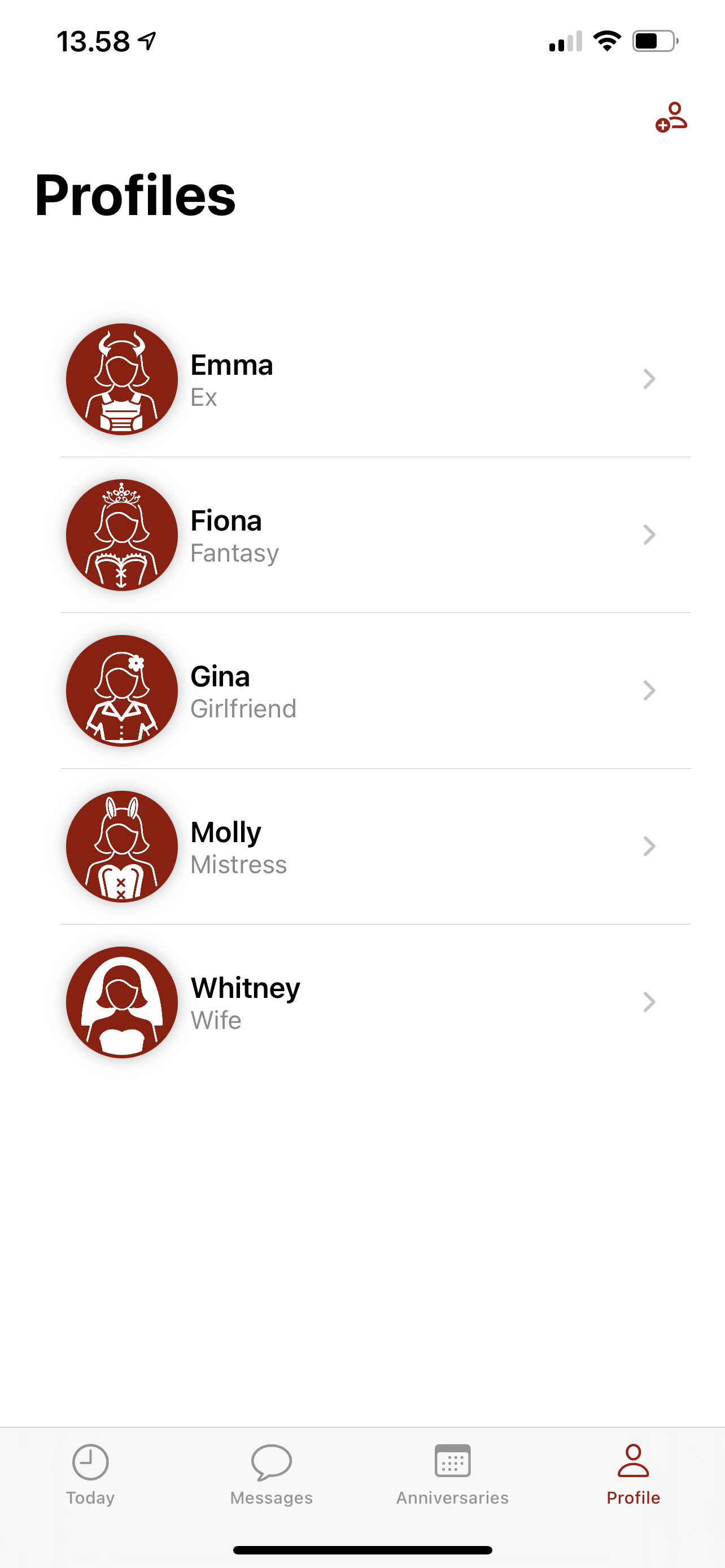 Create as many profiles as you need. The app has no limits for how many wives, girlfriends, or fantasy figures you have.